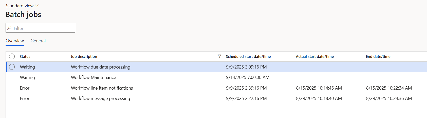 In my sandbox environment, the purchase requisition workflow doesn’t run after submission. When I checked the batch jobs, I noticed errors related to Workflow line item notifications and Workflow message processing.